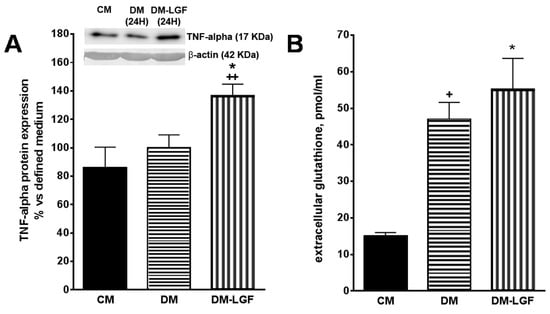 Effects of LGF on tumor necrosis factor alpha (TNF-alpha) protein expression and extracellular glutathione modulation in mesencephalic glial cultures. (A) shows how 100 pg of LGF increased TNF-alpha protein expression in mesencephalic glial cultures, as compared with those cultures maintained in a defined medium for 24 h (DM) or in a complete medium containing 15% FBS (CM). (B) shows how the depletion of FBS increased the extracellular concentration of glutathione in glial cultures, an effect that was not modulated by LGF treatment. The results represent the mean ± SEM of 4–5 independent experiments. * p ≤ 0.05 vs. DM, ++ p ≤ 0.01 vs. CM in A, * p ≤ 0.05 and + p ≤ 0.05 vs. CM in B (ANOVA and Newman–Keuls). In A lane 1: CM; lane 2: DM (24 h); lane 3: DM-LGF (24 h).