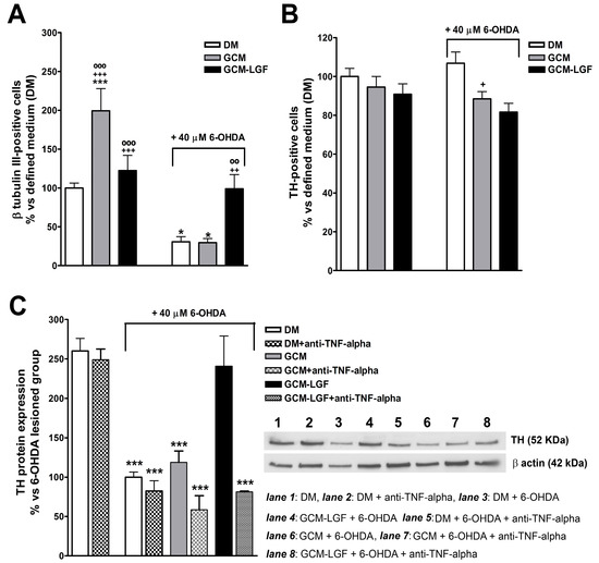Effects of glial-conditioned medium obtained from LGF-treated mesencephalic glia on dopaminergic neurons. By using immunocytochemistry, we analyzed the effect of GCM (grey bars) and glial-conditioned medium obtained from 100 pg/mL GCM-LGF (black bars) on the population of TH-positive (A) and β-tubulin III-positive cells (B) in 40 µM of 6-OHDA-treated mesencephalic neuronal cultures. Note how GCM-LGF prevented the decrease in the percentage of TH-positive cells promoted by the neurotoxin (A). The results represent the mean ± SEM of 7–10 coverslips from 3 independent experiments. * p ≤ 0.05, *** p ≤ 0.001 vs. DM (white bars), + p ≤ 0.05, ++ p ≤ 0.01, +++ p ≤ 0.001 vs. DM and 40 µM of 6-OHDA., ◦◦ p ≤ 0.01, ◦◦◦ p ≤ 0.001 vs. GCM and 40 µM of 6-OHDA. (C) shows the Western blot analysis of TH expression in mesencephalic cultures. Note how GCM-LGF preserved TH reduction, as promoted by 40 µM of 6-OHDA (black bar), as well as how this neuroprotective effect was not observed when cultures were treated with GCM-LGF in the presence of 1 µg/mL anti-TNF-alpha blocking antibody (last dot bar). In (C), lane 1: DM; lane 2: DM and anti-TNF-alpha; lane 3: DM and 6-OHDA; lane 4: DM, 6-OHDA and anti-TNF-alpha; lane 5: GCM and 6-OHDA; lane 6: GCM, 6-OHDA and anti-TNF-alpha; lane 7: GCM-LGF and 6-OHDA; and lane 8: GCM-LGF, 6-OHDA and anti-TNF-alpha. The results represent the mean ± SEM of 3 independent experiments. *** p ≤ 0.001 vs. DM (ANOVA and Newman–Keuls).