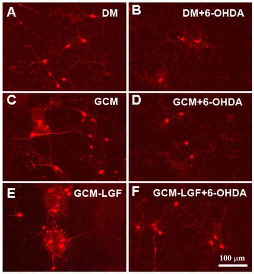 GCM exerted a trophic effect on mesencephalic neurons because their cell bodies were more robust and presented longer neuritic extensions compared to the DM group (Figure 9A,C). GCM-LGF did not change the morphology of the TH-positive cells (Figure 9A,E), but it did protect them from part of the morphological damage caused by 6-OHDA compared to the effects observed in the GCM-treated cells (Figure 9F,D, respectively).