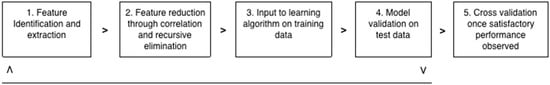 The second step of the feature selection process sought to reduce the total number of features using an iterative recursive feature elimination algorithm. Recursive feature elimination (RFE) performs a greedy search algorithm that iteratively cycles through inputs and determines the best and worst performing inputs. After all inputs are explored, it seeks to reduce the model to the fewest possible inputs as the principles of Occam’s Razor dictates that simplest models lead to the most accurate results []. Although this greedy search is similar in nature to a stepwise logistic regression, it was selected to optimize p-values, standard errors, confidence intervals, bias in R2 values, and create un-biased parameter estimates. It was important to use RFE instead of a stepwise logistic regression because a stepwise algorithm can exacerbate collinearity problems in small datasets, and this was a very small sample size. The scikit-learn python package default recursive feature elimination (RFE) algorithm was used for this step []. The weakest features were removed by an iterative process until an optimal number of features and accuracy were obtained. Iteratively eliminating a few inputs every loop reduces the potential for overfitting and decreases the total number of variables with inter-dependencies to produce an improved model.