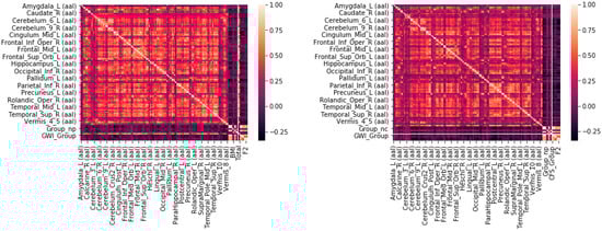To account for multicollinearity, Pearson’s correlation coefficient (R) was calculated for every subject across each feature (AAL region). All Pearson’s correlation coefficients were <0.9 (Figure 2). Therefore, all regions were used for the recursive feature elimination steps. Although all of the 117 regions were included, many were later removed in the respective RFE and logistic regression steps.