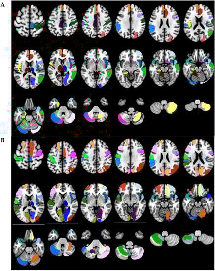 - Tzourio-Mazoyer, N.; Landeau, B.; Papathanassiou, D.; Crivello, F.; Etard, O.; Delcroix, N.; Mazoyer, B.; Joliot, M. Automated anatomical labeling of activations in SPM using a macroscopic anatomical parcellation of the MNI MRI single-subject brain. Neuroimage 2002, 15, 273–289. [Google Scholar] [CrossRef]