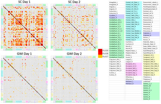 Correlation matrices for the numbers of activated voxels per AAL region. AAL regions were arranged in alphabetical order on the x− and y−axes. The number of significant Pearson correlations (R > 0.7 in orange, R > 0.8 in red, R > 0.9 in dark red) was higher for the SC group on Day 1 and decreased on Day 2. However, GWI had few correlations between regions on either Day 1 or 2. There were no negative correlations (R < −0.5).