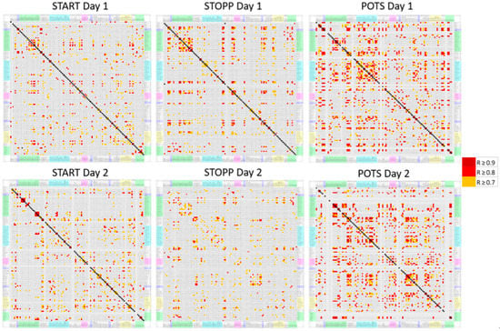 Correlation matrices for the numbers of activated voxels per AAL region. AAL regions were arranged in alphabetical order on the x− and y−axes. The number of significant Pearson correlations (R > 0.7 in orange, R > 0.8 in red, R > 0.9 in dark red) was relatively higher for the POTS group on Days 1 and 2 compared to the other groups. There were no negative correlations (R < −0.5).
