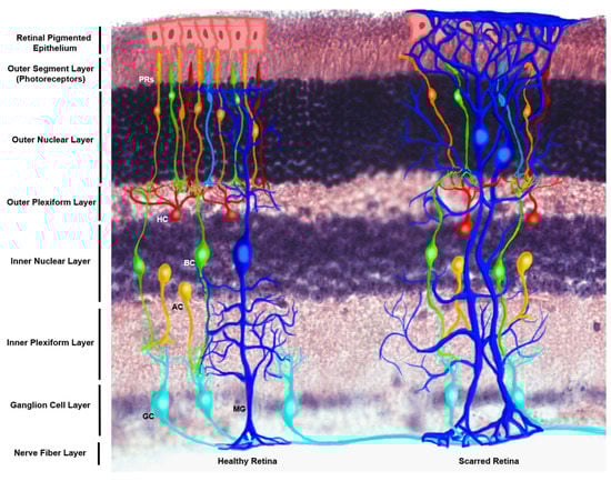 Schematic of the structural distribution of Müller glia (MG) within the healthy and scarred mammalian retina. This figure makes use of an immunostained retinal cross section of the N1CR2 murine model, created to drive up green fluorescent protein (GFP) in interneuron progenitors without changes in retinal structure, function or intrinsic cellular expression based on the transgene [10]. From the posterior to anterior side of the retina (bottom to top) end-feet of MG can be appreciated at the nerve fiber layer, extending their processes through the inner plexiform layer to the inner nuclear layer, where their nuclei reside. MG processes extend up to the interception of the outer nuclear layer and the outer segment layer, constituting the outer limiting membrane, which serves as a biochemical and physical barrier for the retinal tissue. (Left) Healthy retina featuring the nerve fiber layer, which is made of ganglion cells (GC) axons, whose bodies reside in the ganglion cell layer, followed by the inner plexiform layer where ganglion cells connect with amacrine cells (AC) and bipolar cells (BC), whose cell bodies are found in the inner nuclear layer; followed by their connection to horizontal cells (HC) and photoreceptors (PRs) at the outer plexiform layer. Bodies of photoreceptors align in the outer nuclear layer, while the photoreceptor disks lie on the outer segment layer, adjacent to the retinal pigmented epithelium (RPE), which selectively permeates molecules from the choriocapillary network. (Right) Scarring of the anterior side of the retina is characterized by the extension of MG processes beyond the outer limiting membrane into the RPE, which combined with extracellular matrix deposition and addition of glycoproteins comprise the scar that displaces the endogenous cells of the tissue and impedes regeneration.