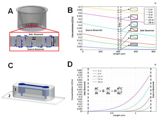 where C (kg/m3)is the solution concentration, t (seconds) denotes time, ū (m/s) is bulk velocity, D (m2/s) is the diffusion coefficient, and x denotes position within the microchannel length [40].