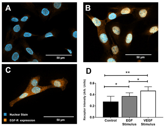 Epidermal growth factor receptor (EGF-R) expression in rMC-1 upon stimulation with epidermal growth factor (EGF) and vascular endothelial growth factor (VEGF). (A) Representative image of EGF-R expression in rMC-1 at basal conditions. (B) Image of EGF-R within rMC-1 after stimulus with EGF for 1 h. (C) Image of EGF-R expression in rMC-1 following VEGF stimulus for 1 h. Orange denotes EGF-R molecules while blue marks nuclear staining (DAPI). (D) EGF-R expression measured using fluorescence intensity in arbitrary units (AU). A minimum of 15 cells per condition were used for these calculations.