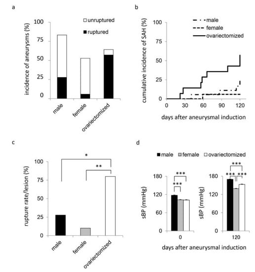 Considering the devastating outcome of subarachnoid hemorrhage (SAH) due to the rupture of an intracranial aneurysm (IA) [1,2], the development of a novel therapeutic strategy to prevent the rupture of IAs is mandatory for social health. Mechanisms underlying the rupture of lesions should, therefore, be clarified. Thus, we attempted to find a cue from well-established epidemiological evidence. Epidemiological studies have consistently demonstrated a higher incidence of SAH in older females or postmenopausal females [3,4,5,6,7,8]. Based on the necessity of clarifying underlying mechanisms of the rupture of IAs, we examined whether sex difference is indeed present, and if present, why, using the already-established animal model of IAs [9].