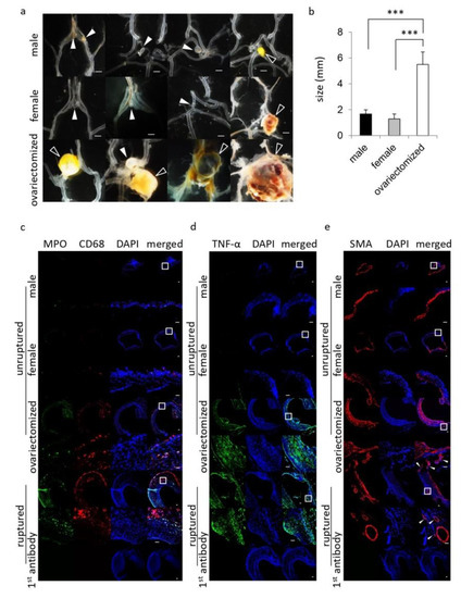 The exacerbation of the pathology of intracranial aneurysm in female rats with the bilateral ovariectomy. Ten-week-old female Sprague−Dawley rats were subjected to the aneurysm model. At 120 days after the surgical manipulations, specimens of induced lesions were harvested. (a,b) The macroscopic image of induced lesions (a) and their size (b) in each group; male rats (n = 18), female rats without ovariectomy (female, n = 10) or female rats with the bilateral ovariectomy (ovariectomized, n = 10). Bar, 1.0 mm (a). The white arrows and the black ones in (a) indicate the unruptured and the ruptured lesions, respectively. Bars in (b) indicate the mean ± SEM. Statistical analysis was done by the Tukey–Kramer method. ***; p < 0.001. (c,d) show similarity of unruptured lesions induced in female animals with the bilateral ovariectomy with ruptured ones. The representative images of immunostaining for a marker for neutrophil, myeloperoxidase (MPO, green in (c)), a marker for macrophage, CD68 (red in (c)), TNF-α (green in (d)), a marker for smooth muscle cell, smooth muscle alpha-actin (SMA, red in (e)), nuclear staining by DAPI (blue) or merged images are shown. The immunostaining without a 1st antibody served as a negative control and the representative images of this staining are shown in the lowest panels. Ruptured lesions were from female rats with the bilateral ovariectomy. The arrow in (e) indicates vasa vasorum with SMA-positive media. The magnified images, corresponding to a square in the upper panels, are shown in the lower panels. Bar, 20 μm.
