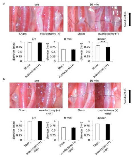 The disturbance of post-stenotic dilatation by the bilateral ovariectomy in female rats. 10-week-old female Sprague−Dawley rats were subjected to the bilateral ovariectomy or a sham-operation. On the 7th day, animals underwent the carotid ligation and the post-stenotic dilatation was observed for following 30 min (a). In some animals, hormone replacement therapy (HRT) was applied after the bilateral ovariectomy (b). Representative macroscopic images of the carotid artery before (pre) and 30 min after the ligation (30 min) are shown. The diameter of the carotid artery was calculated before (pre), just after (0 min) and 30 min after the ligation (30 min). Bars indicate the mean ± SEM (n = 4). Statistical analysis was done by a Welch’s t test. ***; p < 0.001.