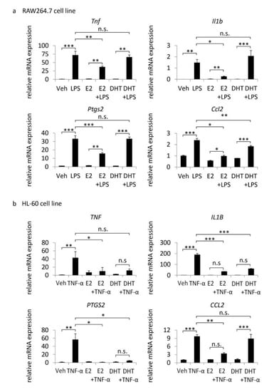 Suppressive effect of the sex hormone on expressions of pro-inflammatory genes in cultured macrophages or neutrophils. RAW264.7 cells (a) or HL-60 cells (b) were pre-treated with β-estradiol (E2, 50 µg/mL) or 5α-dihydrotestosterone (DHT, 50 µg/mL) for 24 h or 3 h, respectively. Cells were then stimulated with vehicle (Veh), LPS (dose) or TNF-α (dose) for an additional 60 min. Expressions of pro-inflammatory genes were examined by quantitative RT-PCR analyses. Bars indicate the mean ± SEM (n = 4). Statistical analysis was done by a Tukey-Kramer method. *; p < 0.05, **; p < 0.01, ***; p < 0.001. n.s.; statistically not significant.