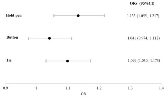 Because differences in age, sex, and H & Y stage could confound the association between hand fine motor skill disability and cognition, a multivariate logistic regression analysis was performed to further understand cognition-specific hand fine motor skill disability in patients with moderate-to-advanced PD. After adjustments of for age, sex, and PD severity (H & Y stage), the presence of any disability in pen holding was significantly associated with dementia (odds ratio [OR]: 1.13, 95% confidence index [CI]: 1.055–1.217), which indicated a 13% higher probability of dementia for PD patients if they had any level of disability in pen holding. The association was significant in knotting (OR: 1.099, 95% CI: 1.030–1.173) as well but not in buttoning (OR: 1.041, 95% CI: 0.974–1.112; Figure 1 and Supplementary Material Table S2).