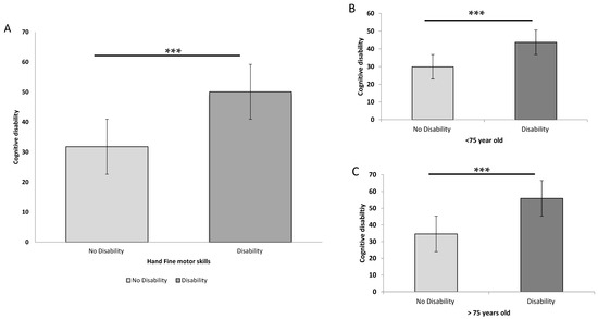 Comparison of cognitive disability between moderate-to-advanced Parkinson’s disease (PD) patients without dementia but with hand fine motor skill disability and those without dementia or hand fine motor skill disability. (A) Cognitive disability was significantly greater in all PD patients with fine motor skill disability than in those without disability. The results were identical for patients with PD aged (B) <75 or (C) ≥75 years. All data are presented as mean ± SD (*** p < 0.001).
