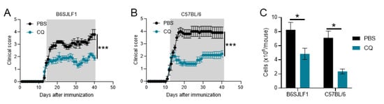 CQ has been shown to prevent EAE development when given prophylactic and to reduced EAE severity when given at disease onset [,]. However, if CQ is able to suppress ongoing relapsing EAE is unknown. B6SJLF1 mice, the offspring of C57BL/6 and SJL mice, develop relapsing EAE when immunized with MOG35-55 [,]. We immunized mice to develop EAE and CQ treatment started at the onset of clinical signs of EAE. Mice treated with PBS fully developed disease clinical signs and the characteristic relapsing feature of this model (Figure 1A). However, mice treated with CQ developed a significantly less severe EAE compared with PBS-treated mice (Figure 1A). These results are on par with those observed in chronic EAE in C57BL/6 mice (Figure 1B). B6SJLF1 mice treated with CQ had a significant decrease in the infiltration of leukocytes to the CNS compared with those treated with PBS (Figure 1C). A similar trend was observed in treated C57BL/6 mice (Figure 1C). These results show that CQ is a potent agent in suppressing the clinical development of two models of EAE.