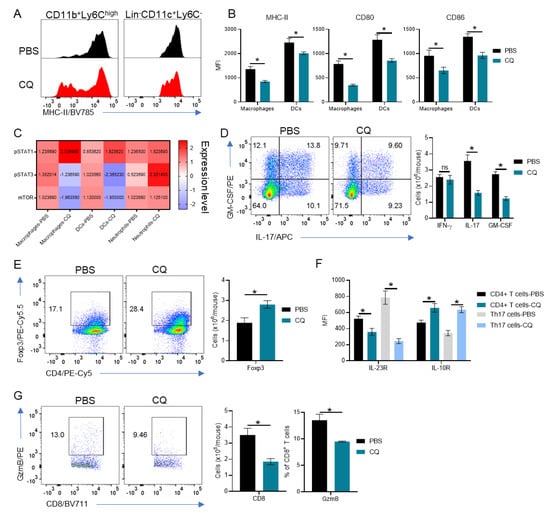 Comprehensive analysis of the immune compartment in the central nervous system (CNS) of CQ-treated mice. CNS cells from EAE B6SJLF1 mice (n = 5/group) at day 21 post-immunization were analyzed by flow cytometry. (A) Representative histogram for MHC-II expression in CD11b+Ly6Chigh macrophages and in Lin-CD11c+Ly6C- DCs. (B) MHC-II, CD80 and CD86 expression in macrophages and dendritic cells (DCs). (C) Mean fluorescent values for pSTAT1, pSTAT3 and mTOR in macrophages, DCs and Ly6G+ neutrophils were measured by flow cytometry. (D) Infiltrating GM-CSF-, IFN-γ and IL-17-producing CD4+ T cells in the CNS of EAE mice. (E) Numbers of Foxp3+ Treg cells. (F) Analysis of IL-23R and IL-10R in total CD4+ T cells and in Th17 cells in the CNS of EAE mice. (G) Analysis of total CD8+ T cell GzmB-producing CD8+ T cell infiltration in the CNS of EAE mice. Values of p < 0.05 (*) were considered statistically significative. Ns: not significative. Results are from three independent experiments.