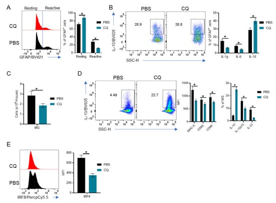 Comprehensive analysis of the stromal compartment in the CNS of CQ-treated mice. CNS cells from EAE B6SJLF1 mice (n = 5/group) at day 21 post-immunization were analyzed by flow cytometry. (A) Analysis of resting (GFAP+/low) and reactive (GFAPhigh) astrocytes. (B) Analysis of IL-1β, IL-6 and IL-10 production by astrocytes. (C) Absolute numbers of MG (CD45+/lowCD11b+Ly6C-) in the CNS of CQ- and PBS-treated mice. (D) Analysis of the expression of the antigen-presenting molecules MHC-II, CD80 and CD86 and of the cytokine profile of MG. (E) IRF8 expression in MG from CQ- and PBS-treated mice. Values of p < 0.05 (*) were considered statistically significative. Results are from three independent experiments.
