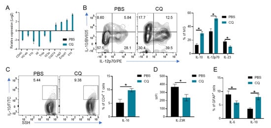 To test their effect on CD4+ T cell activation, we co-cultured CQ-treated MG with CD4+ T cells isolated from naïve WT mice. We observed that CQ-treated MG induced significantly more IL-10 production in T cells than PBS-treated MG (Figure 4C). Moreover, IL-23R in T cells cultured with CQ-treated MG was downregulated when compared with T cells cultured with PBS-treated MG (Figure 4D).