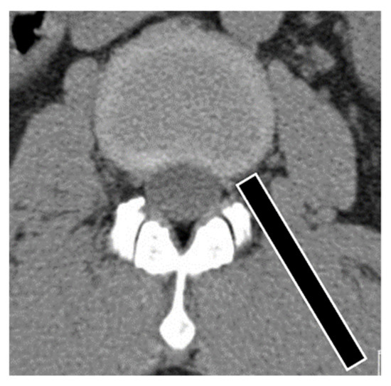 7]. For the transforaminal approach of the upper lumbar area, the skin entry point is typically approximately 7–10 cm from the midline, which is the more medial side than the lower lumbar, and caudal 0.5–1 cm from the midline disc space, which is the upper endplate margin of the inferior body. A steeper angle of needle insertion (from 30°–50°) is safer to prevent neural injury (