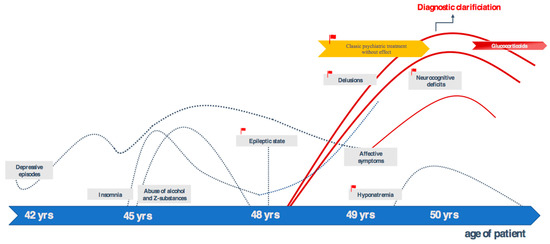 This paper presents the case of a 50-year-old male German academic who developed neurocognitive deficits, affective symptoms, and predominant delusions for over one and a half years. The patient, as well as his family, have given their signed written informed consent for this case report, including the presented images, to be published. The patient reported a pronounced feeling of thirst, although he was drinking 10–20 liters of water a day, and he was absolutely convinced that he would die of thirst. He did not hear an imperative voice encouraging him to drink more. He said that he needed to drink less water and wondered how his body could retain all the liquid. He was delusionally convinced that he had lost the ability to urinate. In contrast, sonography repeatedly detected no residual urine. Moreover, he suffered from severe insomnia (the patient had the feeling of being completely unable to sleep), reduced cognitive performance—for example, being unable to remember dates—and reduced energy levels, as well as complete loss of interests. In the external assessment, disinhibition, flattened affect, accelerated speech and slow thinking were striking. He had suffered from recurrent depressive episodes since he was 34 years old. For the past eight years, depression had been more severe. In the period between 45 years and 48 years, he had taken high doses of Z-drugs in order to treat insomnia. At the same time, alcohol abuse had developed until two years ago (up to the age of 48 years). At the age of 48, he had suffered a single epileptic status, which was interpreted as the result of alcohol and Z-drug withdrawal in an external hospital. At that time, epileptic activity was described in EEG. Over the last two years he had not consumed any substances (Figure 1). In addition, hyponatremia (i.e., 130 mmol/L; reference range: 136–145 mmol/L) had been revealed half a year prior to diagnosis. On admission to our hospital, a normal sodium concentration was measured. Additional repeated laboratory testing showed a urine osmolality of 73 and 45 mosm/kg, respectively, and a suppressed urine sodium concentration of less than 20 mmol/L. During a thirst trial, urine osmolality increased to 651 mosm/kg, which indicates psychogenic polydipsia and excludes a syndrome of inappropriate antidiuretic hormone (SIADH).