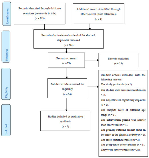 The methodology follows the Preferred Reporting Items for Systematic Reviews and Meta-Analysis (PRISMA) guidelines. The authors systematically reviewed peer-reviewed, English-written articles published in three databases: PubMed, Web of Science, Scopus, Cochrane and Database of Abstracts of Reviews of Effects (DARE). Only intervention studies (randomized controlled trials and non-randomized controlled trials) were included. The selected studies involved groups where the population had to be cognitively unimpaired at the age of 55+. Only studies involving physical activity (aerobic exercises, dancing, running, strength-endurance, exergames, or cybercycling) intervention among healthy older individuals were included. In addition, the intervention had to last at least four weeks.