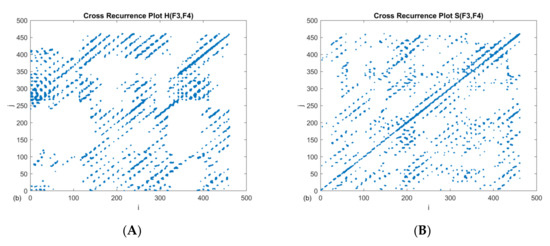 When comparing the values of recurrence indicators, a higher value of RR for H, but a comparable mean length of diagonal lines L for H and S, can be seen. Moreover, the longest diagonal line is more than twice as large for the case H. It should be clarified that the choice of the ε is critical for the RQA analysis. There are several tips for choosing the optimal threshold value. One of them is the percentage of the standard deviation. The next one is the desired value of recurrence points on the RP. It is recognized that a few percent of recurrence points are sufficient, while not identifying all channels as synchronized. The equal epsilon value ε = 1.1 was chosen in this work, in order to compare selected cases with each other. This allowed us to obtain up to 3% recurrence points (Figure 3). Using recurrence analysis with respect to the same dynamic system (in our case, brain dynamics), comparisons between cases can be made either by choosing the ε value each time so as to obtain the same number of recurrence points RR (usually without normalizing time series), or using the same value of ε (normalizing time series). We adopted the second method, although it should be mentioned that if the number of recurrence points (RR) was the same, the results could be different. However, we believe that the approach taken is appropriate for the cross recurrence analysis, given that the noise level in the measured signals should not change too much.