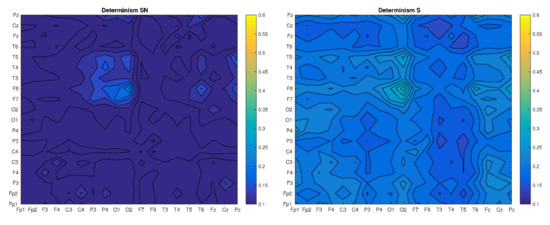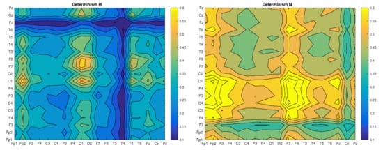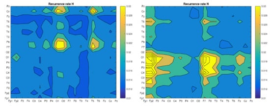 In this sense, we understand the recurrence between two points (RR) as synchronization in amplitudes between their corresponding electrodes, the determinism (DET)—as a percentage synchronization factor, L—length of mean diagonal lines—as a mean time of this synchronization, and the maximal diagonal line (LMAX)—as a longest time of synchronization. Values of those quantifiers (corresponding to Figure 2) are presented in Table 1.