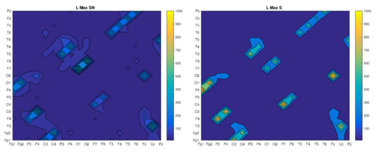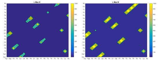 In the case of this recurrence indicator, it can be seen that its highest values occur for the same electrode pairs for each patient. However, they differ in the maximum value (the strength of synchronization), which is several times greater for patients without psychiatric diseases (H and N) than for patients diagnosed with psychiatric diseases (SN and S). In the last case, there is also some blur, which is related to the expansion of additional electrode pairs. The LMAX measure can be associated with the measure of the largest Lyapunov exponent, which is a measure of the predictability of a dynamic system. In this case, if the regions of synchronization do not change too much in all the cases analyzed, the strongest synchronization takes place for patients H and N.