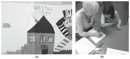 J. loved drawing. Compared to her previous drawings that were very static, she added an increasing number of dynamic characteristics in her storytelling and her drawings (i.e., climbing stairs, drying clothes). She was very precise and participated in the reconstruction of the objects, using language, eye contact and checking whether the therapist or the adult was able to listen to her and whether her work was being appreciated, as shown in Figure 1a.