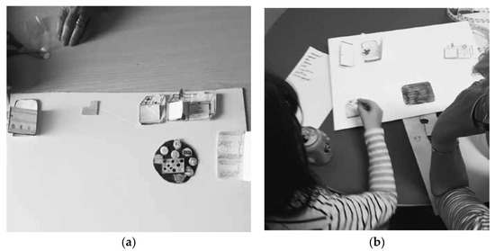 The second evaluation consisting in the action on the represented task. (a) The cooking of the biscuits realized with the icons by J., (b) B. reconstructing the procedure of cooking spaghetti.