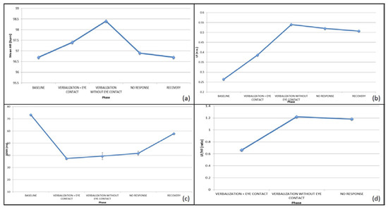 Concerning the ECG, an increased HR and a decreased HRV during verbalization with ocular contact was observed, as shown in Figure 3a,c. Conversely, during verbalization without eye contact, as well as during non-response phases and less cognitively-demanding tasks, the HRV was significantly increased, as shown in Figure 3c. Focusing on the SNS/PNS activation, it is worth noting that the SNS activity increased during the task, with somewhat of a SNS withdrawal during the verbalization with eye contact, probably due to a decrease in the stress level of the subject when interacting with the therapist, as shown in Figure 3b,d.
