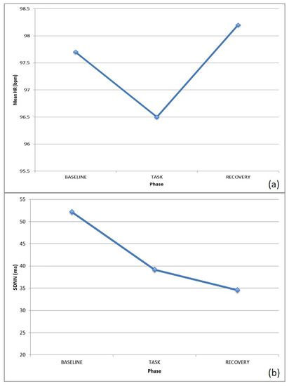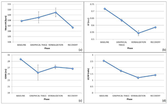 Concerning the ECG signal, the HR was increased from baseline to task during both phases, probably suggesting a higher arousal level while performing the tasks, followed by a similar decrease during recovery. Similar to the first subject, the HRV decreased here during the task, particularly while verbalizing and performing graphical trace (i.e., during a higher emotionally-demanding task), as shown in Figure 4a,c.
