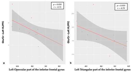 The Spearman’s correlation of Glu/Cr in the left VLPFC and cortical thickness of the opercular (a) and triangular (b) parts of the left inferior frontal gyrus (residuals).