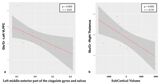 Thalamic regions: a significant negative relationship was found between the Glu/Cr levels in the right thalamus with the subcortical GM volume (p = 0.002; r = −0.78) (Figure 3).
