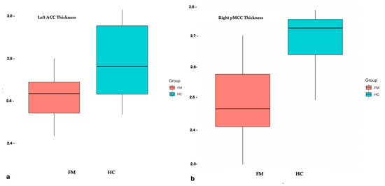 Cortical Thickness differences in cingulate gyrus subparts between fibromyalgia (FM) patients (red boxes) and healthy controls (blue boxes). On each box, the horizontal line is the median and the edges of the box are the 25th and 75th percentiles. The p-value was determined by the two-tailed t-test for independent samples. (a) Left anterior cingulate gyrus; (b) middle posterior part of the right cingulate gyrus.