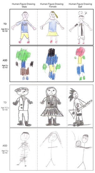 - Lim, H.K.; Slaughter, V. Brief report: Human figure drawings by children with Asperger’s syndrome. J. Autism Dev. Disord. 2008, 38, 988–994. [Google Scholar] [CrossRef] [PubMed]