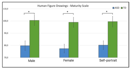 Starting from these premises, in the present study we evaluated the performance of the Draw-a-Man test in a group of children with ASDs, and compared them against a group of age-matched typically developing controls. In particular, we tested two hypotheses: (1) ASDs have lower maturity scores in DAMT, and (2) performance at DAMT differs according to the subjects to-be-depicted (self vs. representation of others). The value of such an investigation is that if a difference is highlighted (i.e., ASDs present lower scores relative to TD), tests based on human figure drawings should not be considered in ASDs as indexing maturity, unless a proper normative ASD population is acquired. In addition to factorial contrasts, the clinical value of the HFD test could be further characterized by correlative approaches testing maturity against neuropsychological scores most common in the clinical practice of autism.