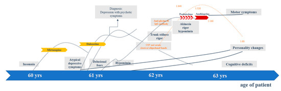 Up to the age of 60, the patient had always been mentally healthy, in a good mood, and active. At the age of approximately 60 years, she developed growing insomnia (with problems in maintaining sleep and early awakening). At the age of 61, a change in her behavior became increasingly apparent. Her energy levels were reduced, she withdrew socially, seemed affectively flattened, and experienced more insecurity and anxiety. In addition, the patient developed delusional fears (felt spied on and therefore wanted the roller shutters closed continuously). Consequently, depression with psychotic symptoms was diagnosed. Muscle tone was assessed as normal at that time. However, retrospectively, a reduced facial expression had already been observed by her husband. The sleep disturbances improved with low-dose mirtazapine (3.75 mg/day). Treatment with duloxetine (60 mg/day) led to slight improvement of delusional fears. In the further course, an increasing personality change was observed. The patient was less happy, more introverted, appeared to be increasingly emotionless, and was no longer able to maintain eye contact. The MRI examination of the brain and the EEG remained inconspicuous (at the age of 61 years). In CSF diagnostics, identical oligoclonal bands (OCBs) in CSF and serum were found, indicating a systemic process. The neurodegeneration markers (tau, p-Tau, β-amyloid quotient, 14-3-3) were in the normal range. At the same time, she developed increasing trunk stiffness and left accentuated rigor. At the age of 62, elevated anti-GlyR IgG serum–antibodies with a titer of 1:640 (reference: <1:20; Laboratory Krone, Bad-Salzuflen, Germany) were found, and a left-accentuated Parkinson’s syndrome became more and more apparent. Anti-inflammatory treatment with prednisolone (3 × 1000 mg/day) was started and repeated five times every 4 weeks. Tolerability was good, but no relevant clinical improvement was observed. The antibody titers only changed by one titer step (to 1:320). Thus, maintenance therapy with azathioprine (150 mg) was started. On this therapeutic regimen, a stabilization of the symptoms could be achieved, but no sufficient improvement. The antibody titers dropped to 1:80 (reference: <1:20). Additional levodopa treatment (with only 187.5 mg/day) was well tolerated, and led to the slight improvement of mood and rigor (see Figure 1).