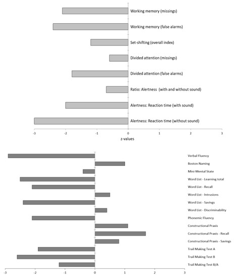 Neuropsychological test results. The testing of attentional performance (TAP) is shown above, and the “Consortium to Establish a Registry for Alzheimer’s Disease” (CERAD) test battery findings below. Z-values lower than 1 are below average, above 1 above average.