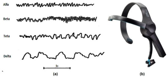 MindWave Mobile by NeuroSky (Figure 2b) is a Brain Computer Interface (BCI) in a headband that captures the EGG waves (Figure 2a) and the eye blink of an user [10]. This device is useful for developers because they can program powerfull algorithms with an interface connecting to mobile devices easily and being able to use it in research applications [11].