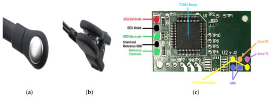 NeuroSky Mindwave Mobile system main parts. (a) Dry Electrode. (b) Reference and Ground Electrodes. (c) EEG biosensor TGAM1 with Communication Module.