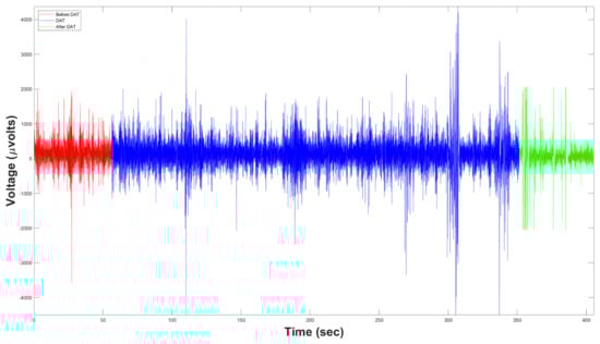 All three subsystems interact to determine whether or not a DAT is effective for ISCP patients. For analyzing EEG data, we decomposed the EEG signal into functionally distinct frequency bands: (0.5–4 Hz), (4–8 Hz), (8–12 Hz), (12–30 Hz), (30–60 Hz), and All Bands (0.5–60 Hz) by applying FFT, in order to obtain an estimate of the Power Spectral Density (PSD), expressed in [17]. Later, we explored the behavior of the three ISCP patients using FFT and SAA from EEG signals [18]. The EEG RAW data were time series showing the cerebral brain activity (voltage versus time) At rest or before (Figure 6a) and during DAT (Figure 6b) for ISCP patients, as recorded by the first frontopolar electrode () by means of a EEG biosensor TGAM1 Module, Figure 3c [19].