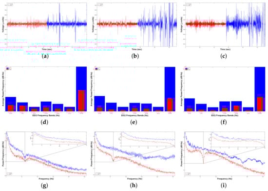 On the one hand, Figure 7a–c show a higher brain activity during DAT than before. Likewise, the FFT analysis points out an average great increment of 298.74% in the average power spectral density of data during DAT respect to before, causing an increment on every spectral band, Figure 7d–f. Moreover, Figure 7g–i show the entire power spectral density from 0 to 256 Hz (half of sampling frequency ), where it can be noticed that the overall power is higher in all cases when a DAT was performed.