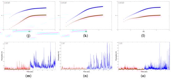 Results of Dolphin-Assisted Therapy (DAT) efficiency for RAW EEG Brain activity (first row, (a–c)) of three child patients with Infantile Spastic Cerebral Palsy (ISCP) (each column is a patient). Periodogram (second row, (d–f)) and Average Spectogram (third row, (g–i)) using FFT Power Spectrum Density. Fluctuations EEG Brain activity (fourth row, (j–l)) and Crossover (fifth row, (m–o)) using Self-Affine Analysis. The functions in red mean that the sample was taken before DAT, while the blue ones mean during DAT.