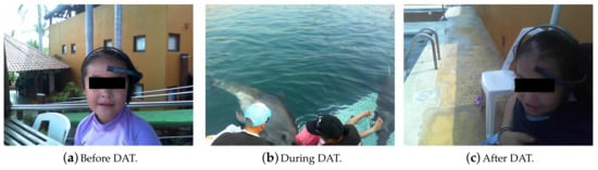 The recent proliferation of sensor technology applications in therapies for children’s disabilities to promote positive behavior among such children has produced optimistic results in developing a variety of skills and abilities in them. Dolphin-Assisted Therapy (DAT) has also become a topic of public and research interest for these disorders’ intervention and treatment. This work exposes the development of a system that controls brain–computer interaction when a patient with different abilities undergoes a DAT. To develop the proposed system, TGAM1, i.e., ThinkGear-AM1 series of NeuroSky company, was used, connecting it to an isolated Bluetooth 4.0 communication protocol from a brackish and humid environment, and a Notch Filter was applied to reduce the input noise. In this way, at Definiti Ixtapa-Mexico facilities, we explored the behavior of three children with Infantile Spastic Cerebral Palsy (Experiment 1), as well as the behavior of Obsessive Compulsive Disorder and neurotypic children (Experiment 2). This was done applying the Power Spectrum Density (PSD) and the Self-Affine Analysis (SSA) from Electroencephalogram (EEG) biosignals. The EEG Raw data were time series showing the cerebral brain activity (voltage versus time) before and during DAT for the Experiment 1, and before, during DAT and after for the Experiment 2. Likewise, the EEW RAW data were recorded by the first frontopolar electrode (FP1) by means of an EEG biosensor TGAM1 Module. From the PSD we found that in all child patients a huge increment of brain activity during DAT regarding the before and after therapy periods around 376.28%. Moreover, from the SSA we found that the structure function of the all five child patients displayed an antipersistent behavior, characterized by , for before, during DAT and after. Nonetheless, we propose that one way to assess whether a DAT is being efficient to the child patients is to increase the during DAT time when the samples are collected, supposing the data fitting by a power law will raise the time, displaying a persistent behavior or positive correlations, until a crossover appears and the curve tends to be horizontal, pointing out that our system has reached a stationary state.