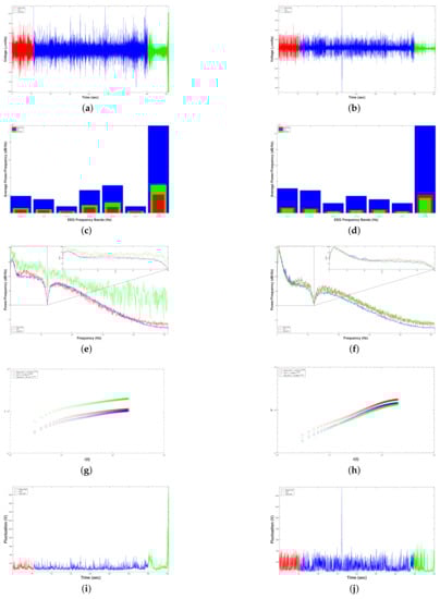 Results of DAT efficiency for RAW EEG Brain activity (first row, (a,b)) of two child patients (each column is a patient). Periodogram (second row, (c,d)) and Average Spectogram (third row, (e,f)) using FFT Power Spectrum Density. Fluctuations EEG Brain activity (fourth row, (g,h)) and Crossover (fifth row, (i,j)) using Self-Affine Analysis. The functions in red mean the sample taken before DAT, while blue and green ones mean during DAT and after DAT, respectively.
