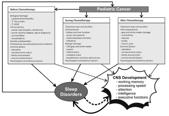As a consequence of all the above considerations, the relationship and interactions between pediatric cancer, chemotherapy, sleep and CNS development/damage and cognitive function is complex and schematically represented in Figure 1.