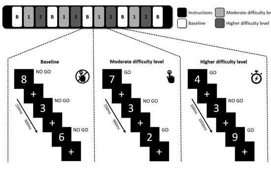 The modified sustained attention to response task paradigm. In baseline blocks, participants did not have to respond (No-Go). In the moderate and higher difficulty level participants had to responded by button press to all digits (Go) except for the digit “3” (No-Go). The difficulty levels differed in duration of stimulus presentation (250 ms in moderate difficulty level and 100 ms in higher difficulty level).