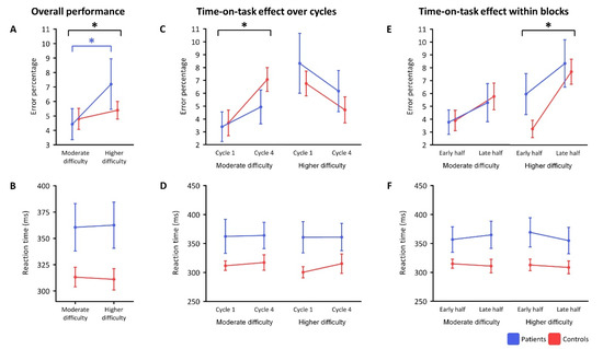 Behavioral results. (A,B) show the performance over the entire task per group. (C,D) show the time-on-task performance over repetitions (repetition 1 vs. repetition 4). (E,F) show the time-on-task performance within blocks (early half vs. late half). Significant differences (p < 0.05) are highlighted with an asterisk (*) and significant differences in black represent all subjects combined.