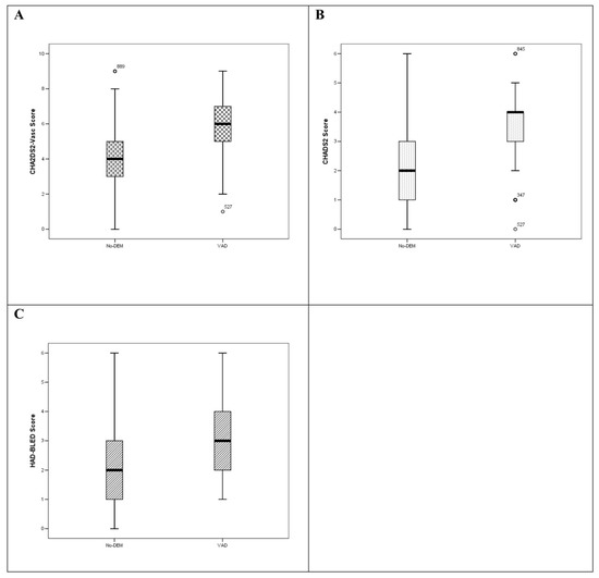 Of note, CHA2DS2-VASc and CHADS2 scores were significantly lower in No-DEM patients than in VAD (Table 2, Figure 1A,B). The HAS-BLED score was significantly higher in patients with VAD than in No-DEM subjects (Table 2, Figure 1C).