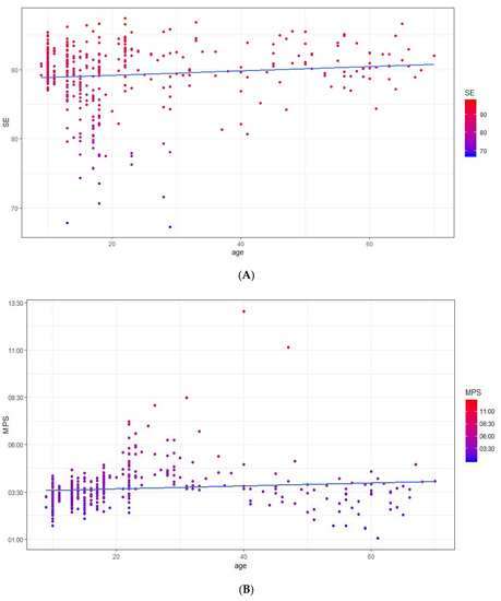 Scatterplots showing the relationship between age and the sleep efficiency (SE) (%) sleep parameter (A) and the relationship between age and the midpoint of sleep (MPS) (clock time) sleep parameter (B).